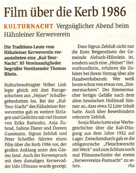 Nach den Begrüßungen durch den ersten Vorsitzenden Thomas Rhein und dem "Kul-Tourminister" Volker Link gab es verschiedene Gedicht und Geschichten aus Hejne und Umgebung zu hören. Die Vortragenden waren Erika Bartonitz, Sabine Dieter, Doreen Gußmann, Sigrun Zehfuß, Sonja Rhein und Anja Zubrod. Aufgelockert wurde die Veranstaltung durch - von Peter Scheffler zusammengestellte - Filmausschnitte vom "Kerweumzug 1986", von der "Kerwered 1986" und der ersten "Kerwefastnoacht 1996". In diesen, inzwischen "alten" Filmen, konnten sich viele der Anwesenden wiederentdecken.