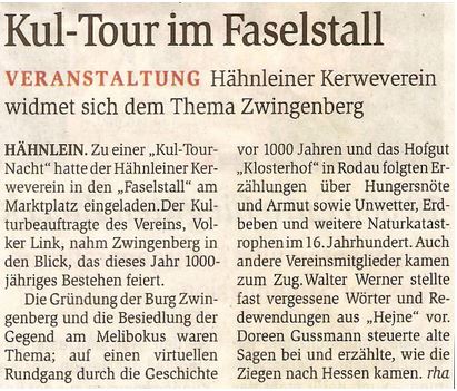 Am Freitag, dem 24. August war es wieder soweit. Die 13. Kul-Tour-Nacht des Hejner Kerwevereins stand auf dem Programm. Als Thema für diesen Abend hatte sich unser "Kul-Tour-Minister" Volker Link das Thema "1000 Jahre Zwingenberg und die Zwingenberger Burg" zur Recherche vorgenommen.