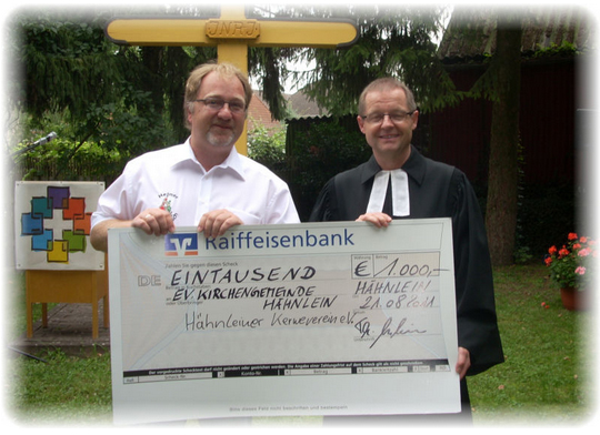 Am 22. August 2011 übergab der erste Vorsitzende des Kerwevereins Thomas Rhein dann während des Gottesdienstes am Gemeindefest der evangelischen Kirchengemeinde Hähnlein einen Scheck an Pfarrer Horst Seyberth. Durch den Verzicht auf Gastgeschenke und Geschenke für die Mitwirkenden an der Jubiläumsveranstaltung kam so eine Spende von 1000,- Euro zusammen. Diese kommen der neuen Kirchenfensterverglasung zu Gute.