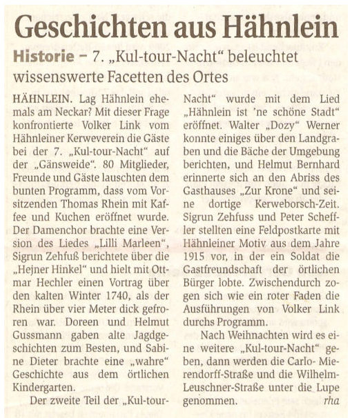 Am 23. August 2008 fand die 7. Kul-Tour-Nacht des Hejner Kerwevereins statt. Auf Grund der schlechten Wettervorhersagen konnte die Veranstaltung nicht "off de oald Bägg" stattfinden. Als Ausweichlocation ging man auf den Grillplatz "Gänseweide".