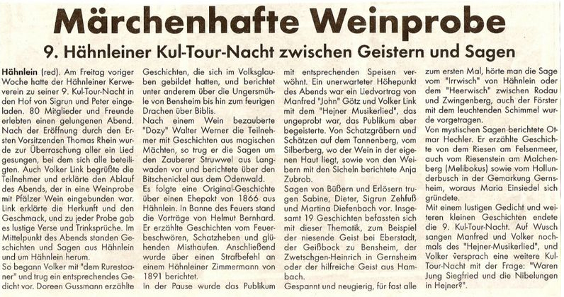 Die 9. Kul-Tour-Nacht des Hähnleiner Kerwevereins fand am Freitag, dem 10.Juli 2009 statt. Doch traf man sich nicht wie geplant "beim Knoche off de oald Bägg" sondern, wegen des schlechten Wetters, bei "de Sigrun im Houf".